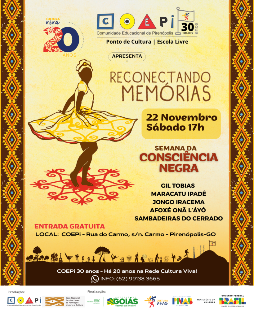 O Ponto de Cultura e Escola Livre COEPi realiza, no dia 22 de novembro, a 2ª edição do encontro Reconectando Memórias, como parte das celebrações do Dia da Consciência Negra em Pirenópolis (GO). O evento acontece na sede da instituição, das 17h às 22h, com entrada gratuita.